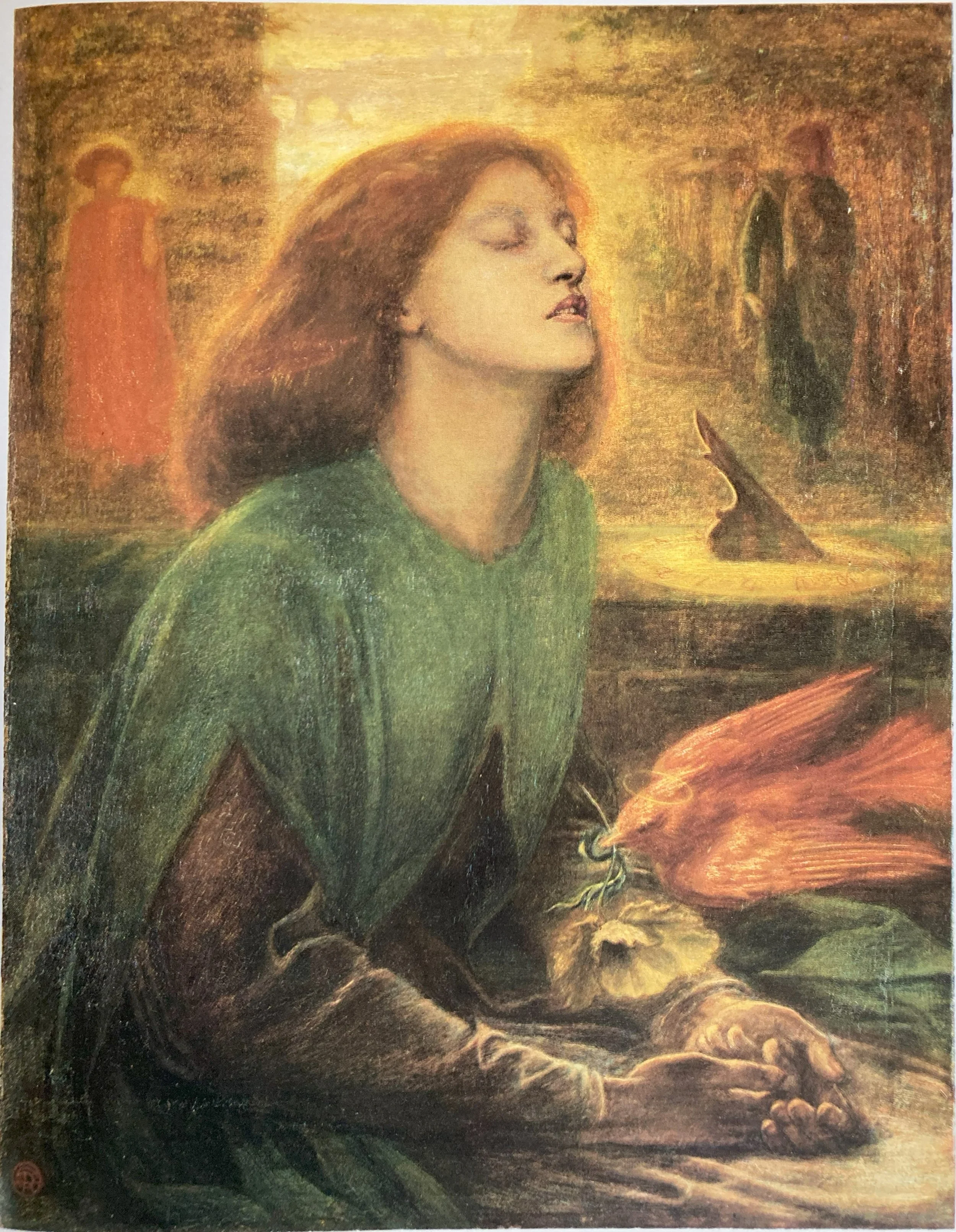 Painted as a memorial to Rossetti’s wife, Elizabeth Siddal, who died in 1862 from an accidental overdose of Laudanum. Rossetti had in fact begun the picture many years before, but took it up again in 1864 and completed it by 1870. It is one of his most intensely visionary, Symbolist pictures, and marks a new direction in his art. Once again, it represents the death of Beatrice in Dante’s Vita Nuova. Beatrice sits in a death-like trance, while a bird [dove], the messenger of Death, drops a poppy into her hands. In the background the figures of Love, holding her flame, and Dante gaze at each other, with the Ponte Vecchio and the Duomo of Florence silhouetted behind them.