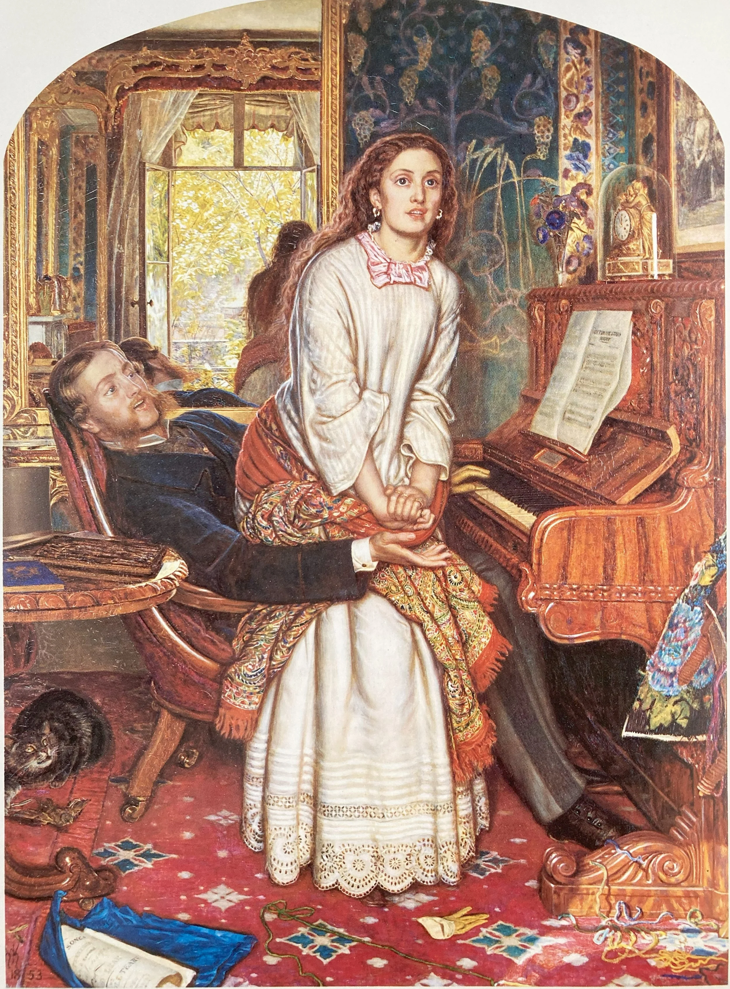 The first Victorian picture to grapple with the thorny problem [for the time] of prostitution. A kept woman, sitting at the piano with her lover, is suddenly stricken by remorse, and stands up; while the man goes on playing the piano, ignorant of what has happened. Hunt attempted to treat the subject with the utmost seriousness, inscribing one religious quotation on the frame, and two more in the Royal Academy catalogue. This did not prevent the critics from attacking it - the Athenaeum critic wrote that it was ‘drawn from a very dark and repulsive side of domestic life …’; but Ruskin once again came to the rescue, writing a long explanation and defence of the picture in The Times.