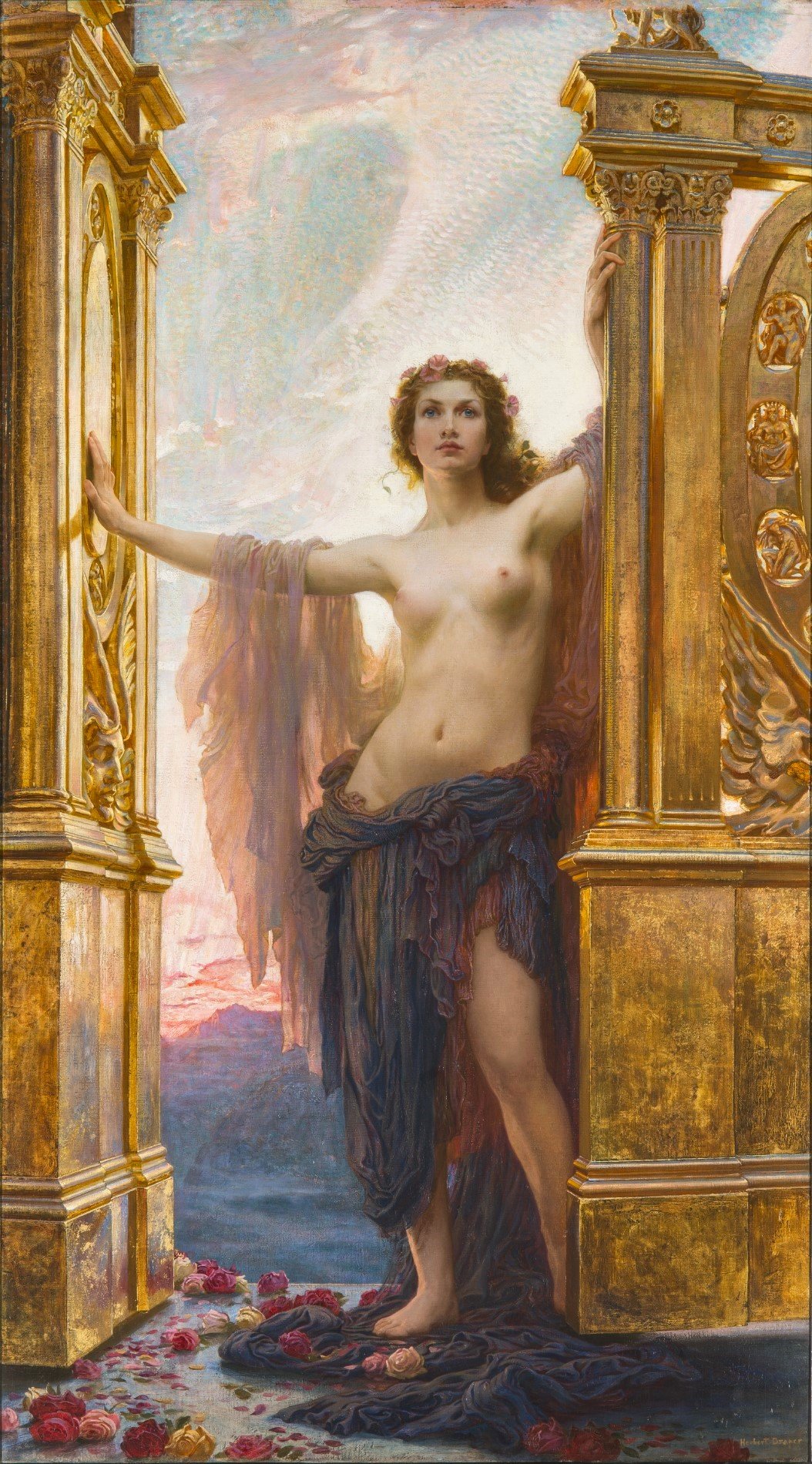 Draper’s iconic image of the Roman goddess of the dawn, Aurora (Eos in Greek), was painted in the last year of the nineteenth century, and heralded the dawning of a brave new world for the Victorians. According to The Globe, it ‘… combined happily a touch of modern ease with the formalities of the Academic manner.’ Draper, usually preferring to paint Greek legends, may have been influenced to paint the model - Florrie Bird - as Aurora, based on the description of Eos from Ovid’s classic poem, Metamorphoses - ‘…far in the crimsoning east, wakeful Dawn threw wide the shining doors of her rose-filled chambers.’ The golden gates she stands by bear discs symbolising the sun, surrounded by medallions of figures representing the planets including Jupiter, Mercury and Venus, together with the winged-head of Time.
