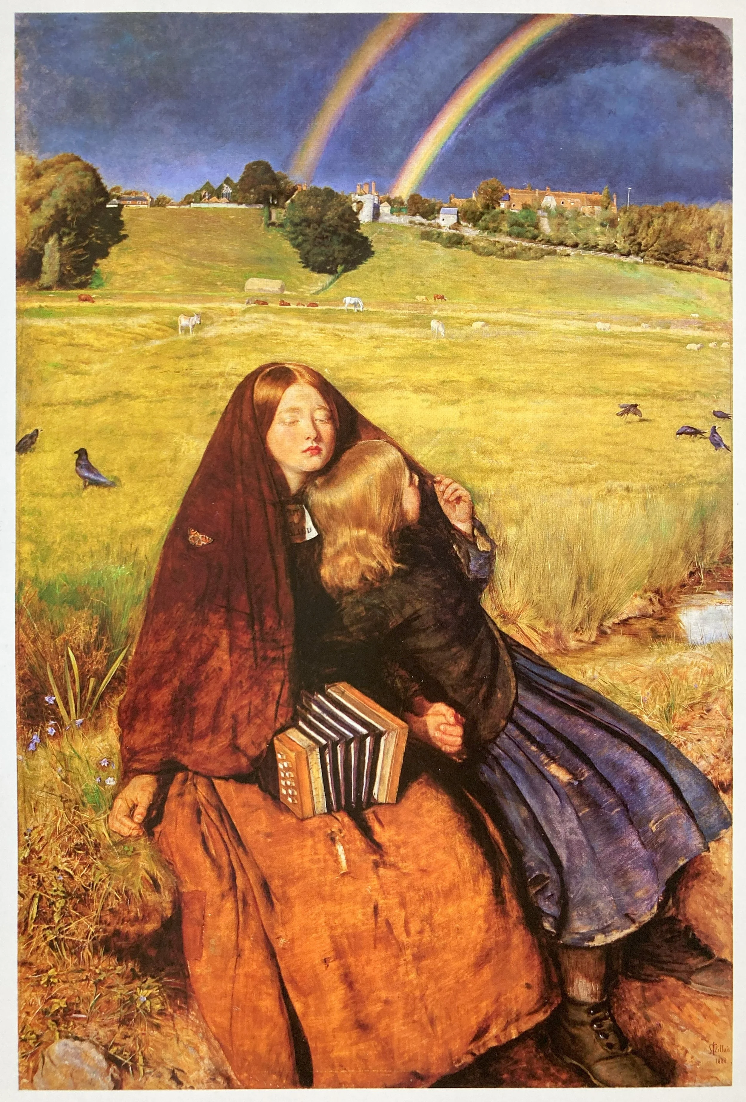 A blind beggar girl and her companion rest by a roadside stream, waiting for a passing shower to clear. The background is a view of Winchelsea from the east; the two girls - Matilda and Isabella - were local girls from Perth, Scotland, where Millais often stayed with Effie’s [his wife’s] parents. Technically, it is perhaps the most brilliant of all Millais’ Pre-Raphaelite works, especially the landscape with the rainbow and thunder-clouds. Rossetti described it as ‘one of the most touching and perfect things I know’, and Ruskin praised the intensely luminous brilliance of colour, ‘The freshly wet grass is all radiant through and through with the new sunshine; the weeds at the girl’s side as bright as a Byzantine enamel, and inlaid with blue veronica …’