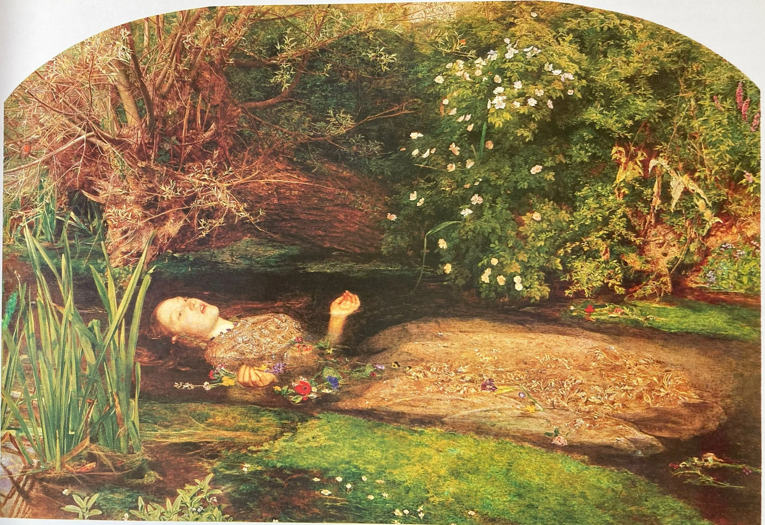 One of the outstanding masterpieces of the PRB, combining a Shakespearean subject with a Ruskinian intensity of natural observation. The background was painted in the summer of 1851, on the River Ewell in Surrey. During the winter of 1851-52, Elizabeth Siddal posed for Ophelia, lying fully-dressed in a bath kept warm by means of lamps underneath. Millais purchased an antique dress for her to pose in, and it took him nearly four months to complete the figure. According to William Michael Rossetti, this picture is the best likeness of Elizabeth Siddal ever painted. The idea of painting the mad Ophelia drowning was highly original at the time, although it was to be repeated by many later Pre-Raphaelite artists.